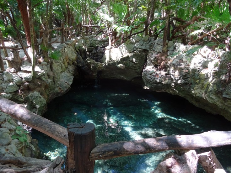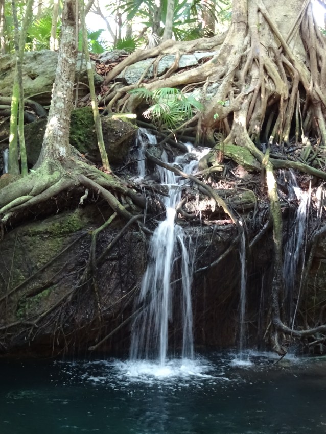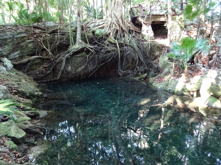 These Cenotes are springs from a vast underground water reservoir in the jungles of the Yucatan. The ancient Mayan civilization flourished because access to this water was a sacred source of life. Down another trail, we stumbled upon yet another small cenote that looked like it was the lens in the eye of God. And yes of course, we climbed right in and swam in the coolness!
